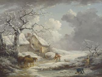 Keywords: george morland painting oil on canvas artistic nature outside sky clouds landscape winter snow ice house farm rural woman children pond frozen horses dog