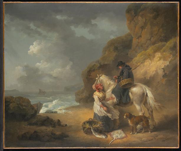 | Keywords: George Morland - Selling Fish - 2001.44 - Minneapolis Institute of Arts.jpg Woman with a basket containing a large fish and a stingray presenting them to a man on a white horse with a dog; rocky coastal scene with boats at left 24 1/2 x 29 1/2 in 62 23 x 74 93 cm canvas 2001 44 https //api artsmia org/images/33590/2371/large jpg Q1700481 Oil on canvas Selling Fish https //collections artsmia org/index php page detail id 33590 Q20891669 | ||||