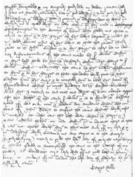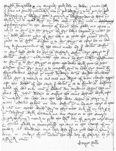 | Keywords: GeorgeRolle LetterToLadyLisle 28Feb1539.jpg en Letter dated 28 February 1539 from George Rolle d 1552 of Stevenstone Devon to Honor Plantagenet Viscountess Lisle <blockquote> Right honourable and my singular good lady my duty remembered I have me humbly recommended unto your good ladyship and to my good Lord Lyle advertising your ladyship that I received your ladyship's letter by which ye willed me to speak with my Lady Coffyn for her title in East Haggynton in the county of Devon who had one estate in tail to him and to his heirs of her body begotten; and now he is dead without issue of his body so that the reversion should revert to Mr John Basset and to his heirs so there be no let nor discontinuance of the same made by Sir William Coffyn in his life Howbeit Mr Richard Coffyn next heir to Sir William Coffyn claimeth the same by his uncle's feoffment to him and to his heirs so that the law will put Mr John Basset from his entry and to compel him to take his action of form down which is much dilatory as Mr Basset knoweth albeit I intend to sue unto one writ of diem clausit extremum after the death of the said Sir William and so to find Mr Basset's title if we may come and attain any evidence when we come home of John Davy to enforce the same which will cost v marks at least But the best way when Mr Harys and I meet shall be taken My Lady Coffyn is in Leicestershire so that I could not speak with her in this matter And if my lord or your ladyship will command me any service into the country I God willing intend to ride the viii th day of March next coming and shall be glad to accomplish the same to the utterest of my power as knoweth our Lord who preserve you both in honour long to endure Ffrom London the last day of Ffebruary by your assuryd servant George Rolle </blockquote> Byrne Muriel St Clare ed The Lisle Letters 6 vols University of Chicago Press Chicago London 1981 vol 5 p 764 George Rolle d 1552 of Stevenstone Devon 1539-02-28 PD-old-100 Secretary hand |