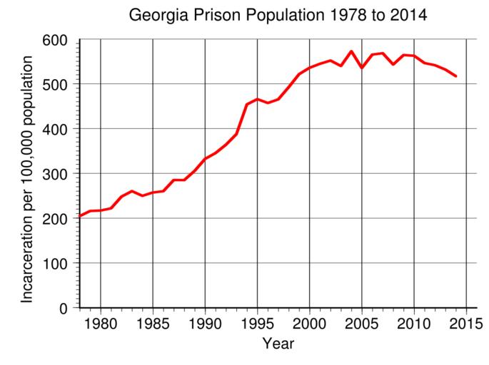 | Keywords: Georgia Prison Population.svg en Georgia prison incarceration rate per 100 000 population from 1978 to 2014 While not the highest incarceration rate Georgia though has the highest rate of adult supervision in the country Data from http //www bjs gov/index cfm ty nps BJS 2016-05-10 own Delphi234 other versions current annually Generated with Wikimedia SVG Chart SVG Chart/box cc-zero Prisons in Georgia U S state Imprisonment and detention rates in the United States | ||||