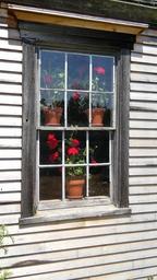 Keywords: geranium window red flower plant clay pot house window exterior