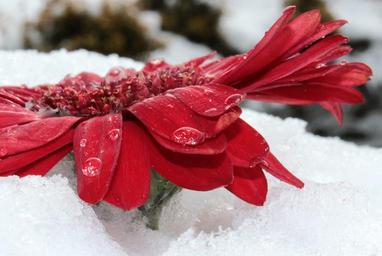 Keywords: gerbera blossom bloom flower red drop of water snow