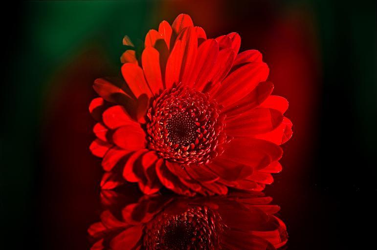 Keywords: gerbera schnittblume flower plant blossom bloom red lichtspiel mirroring close
