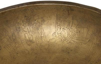 | Keywords: German - Bowl with Scenes from the Legend of St Ursula - Walters 5369 - Detail B.jpg The narrative on this basin tells the story of Saint Ursula and her 11 000 companions who embarked on a pious journey from England to the Continent only to be met by the Huns in Cologne and slaughtered Ursula was warned of her impending doom according to the legend but willingly accepted martyrdom to join the kingdom of heaven The narrative is executed in a simple engaging manner The movement of Ursula and her companions is echoed in the narrative progression around the bowl as one turns it to follow the story The kinetic dimension of the display would likely have made this manner of recounting the saint's legend more memorable than simple recitation Indeed some scholars have suggested that bronze vessels of this type might have been used for teaching while others maintain that they might have played a role in liturgical hand-washing performed by nuns In the latter instance the swirling ocean crossed by Ursula must have looked quite realistic when seen through the rippling water that filled the bowl century 12 Medieval copper alloy cm 6 5 28 7 accession number 53 69 6988 Signol M E G Reidy Sale London July 19 1929 Bacri Paris Léon Gruel Paris Henry Walters Baltimore by purchase Walters Art Museum Henry Walters Acquired by Henry Walters Transcription Engraved on rim of bowl DESPONSANDA DAT HIS RESPONSIO BLANDA / VIRGINEO QUE GRAVES MITTIT PC AGMINE NAVES / POSTQUAM TURBA RUDIS FUIT HIS EXERCITA LUDIS CARBASA PANDUNTUR AGRIPPINA QUE FERUNTUR / QUE LOCA VIRGINEIS DISCUNT SACRANDA TROPHEIS / HINC VIA DIRGITUR QUA MOX BASILEA SUBITUR; Translation The betrothed gives a favorable answer / He sends great ships for the crowd of young women / After the uneducated crowd was practiced in these games the sails are raised bearing them to Agippina Cologne / This place they teach is made sacred through the triumph of the virgins / from here they took the direct way to Basel; Transcription Engraved in the border around the central medalion URSULA SOLLICITE SACRA DISCIT DOGMATA VITAE; Translation Ursula eagerly teaches the holy dogma of life place of origin Germany Walters Art Museum license Medieval metalwork in the Walters Art Museum Bowl with Scenes from the Legend of St Ursula in the Walters Art Museum 53 69 Media contributed by the Walters Art Museum needs category review |