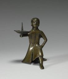 | Keywords: German - Candlestick with a Young Page - Walters 5484.jpg Candles were expensive and used by affluent households This candle holder demonstrates the desire to make home furnishings ornamental imaginative and indicative of status It is cast in the shape of a young page who kneels to hold the candle for his lord -- understood to be the person to whom this candle stick belonged century 14 15 Medieval bronze cm 14 6 10 8 11 7 accession number 54 84 20860 Lehmann secretary to Baron Alphonse de Rothschild Paris Henri Daguerre Paris date and mode of acquisition unknown Henry Walters city Baltimore Walters Art Museum Henry Walters Acquired by Henry Walters 1927 Highlights from the Collection The Walters Art Gallery Baltimore 1998-2001 place of origin Germany Walters Art Museum license Medieval metalwork in the Walters Art Museum German art in the Walters Art Museum Media contributed by the Walters Art Museum needs category review |