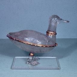 | Keywords: German - Covered Bowl in the Shape of a Duck - Walters 4175.jpg This dazzling carved polished and engraved covered bowl is amusingly shaped as a duck and would have been judged by contemporaries as a triumph of artifice in the imitation of nature in such an unlikely and difficult material Contemporaries would also have admired the virtuosity of the execution not only in the carving but in the engraving of the feathers By 1600 the skills in carving rock crystal associated with the workshops of Milan were also found at the courts of central Europe Bowl ca 1600; Mounts 19th century rock crystal glass enamel cm 16 4 accession number 41 75 37039 Prince Baucino Palermo Jacques Seligmann Paris by purchase Henry Walters city Baltimore Walters Art Museum Henry Walters Acquired by Henry Walters 1914 World of Wonder The Walters Art Gallery Baltimore 1971-1972 place of origin north Italy Walters Art Museum license Glassware in the Walters Art Museum Baroque art in the Walters Art Museum German art in the Walters Art Museum Ducks in art Glass engraving Media contributed by the Walters Art Museum needs category review |