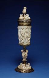 | Keywords: German - Covered Tankard with the Olympian Gods - Walters 71470.jpg Along with its associations with distant lands and gigantic beats the round shape of the elephant tusk which is hollow at the base made ivory a popular material for carved cups and tankards to be used and admired as luxury goods especially by wealthy Germans The subjects of the reliefs are usually classical permitting lightly draped gods and goddesses sensuously interpreted in the creamy smoothly polished ivory that appeals to the touch as well as to the eye The goal was a composition running seamlessly around the vessel Instead of a single story this artist depicts pairs of Olympian gods including Jupiter and Juno in affectionate relationships garments and gestures gracefully leading the eye to the next couple between 1685 1700 Baroque carved ivory gilt on silver cm 32 4 7 2 accession number 71 470 7171 Jacques Seligmann Paris by purchase Henry Walters city Baltimore Walters Art Museum Henry Walters Acquired by Henry Walters 1912 World of Wonder The Walters Art Gallery Baltimore 1971-1972 Ivory The Sumptuous Art The Walters Art Gallery Baltimore 1983-1984 place of origin Augsburg Germany Walters Art Museum license Baroque sculpture in the Walters Art Museum German art in the Walters Art Museum Media contributed by the Walters Art Museum needs category review |