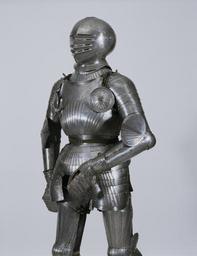 | Keywords: German - Maximilian Armor - Walters 51584 - Detail B.jpg Towards the end of the reign of Maximilian I as Holy Roman Emperor 1493-1519 a new style of armor emerged in Germany Sometimes called Maximilian armor it was in fashion from about 1510 until 1530 Its distinctive fluting gave it strength without increasing its already substantial weight a complete suit of armor weighed 40 to 50 pounds Though the elements of this suit are stylistically consistent they were assembled from more than one source An armored knight on horseback fought with a lance but one on foot fought with a sword ca 1510 1520 Renaissance steel Armor cm 166 75 52 7 accession number 51 584 25997 Hefner-Altneck Munich 1904 date and mode of acquisition unknown no 47 pl 14 Keasbey date and mode of acquisition unknown Henry Walters Baltimore 1925 mode of acquisition unknown Walters Art Museum Henry Walters Acquired by Henry Walters 1925 place of origin Germany Walters Art Museum license Renaissance applied arts in the Walters Art Museum German art in the Walters Art Museum Media contributed by the Walters Art Museum needs category review |