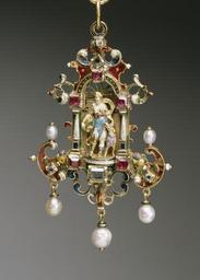 | Keywords: German - Pendant with the Goddess Diana - Walters 44442.jpg Walters Art Museum artwork Anonymous German <br/> In addition to religious motifs Renaissance pendants often presented mythological or genre subjects This example shows Diana the Roman goddess of the hunt accompanied by a dog and carrying her bow quiver and a horn Analysis of the enamels confirmed a 16th-century date for the figural group; however the enameling on the mount proved to be of a later date As the design of the whole piece is typical of pendants designed by Hans Collaert Flemish before 1555-1609 which set a central figure within an elaborate frame of upturned curvilinear details it is possible that the later elements on the mount are restorations made due to damage to the original enamel which chips easily 16th century; with 19th century restorations gold enamel diamonds rubies pearls cm 6 67 5 24 accession number 44 442 32965 Henry Walters Baltimore date and mode of acquisition unknown Walters Art Museum Henry Walters Acquired by Henry Walters The Triumph of Humanism A Visual Survey of the Decorative Arts of the Renaissance California Palace of the Legion of Honor San Francisco San Francisco 1977-1978 Jewelry - Ancient to Modern The Walters Art Gallery Baltimore 1979-1980 Objects of Adornment Five Thousand Years of Jewelry from the Walters Art Gallery Baltimore Cooper-Hewitt National Design Museum New York; Chrysler Museum of Art Norfolk; Carnegie Museum of Art Pittsburgh; San Antonio Museum of Art San Antonio; Philbrook Museum of Art Tulsa; Honolulu Academy of Arts Honolulu; New Orleans Museum of Art New Orleans; Milwaukee Art Museum Milwaukee; Minneapolis Institute of Arts Minneapolis; Toledo Museum of Art Toledo; The John and Mable Ringling Museum of Art Sarasota 1984-1987 Jewelry from the Walters Art Museum and the Zucker Family Collection The Walters Art Gallery Baltimore 1987 Bedazzled 5 000 Years of Jewelry from the Walters Art Museum Frist Center for the Visual Arts Nashville; The John and Mable Ringling Museum of Art Sarasota; The Walters Art Museum Baltimore 2006-2009 Bedazzled 5 000 Years of Jewelry El Paso Museum of Art El Paso 2010 place of origin Antwerp Belgium Walters Art Museum license Jewellery of Germany Diana in jewellery Jewellery in the Walters Art Museum German art in the Walters Art Museum Media contributed by the Walters Art Museum needs category review Media contributed by the Walters Art Museum needs artist review |
