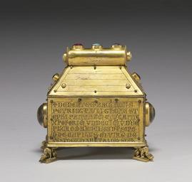 | Keywords: German - Reliquary of the Virgin and Saints - Walters 5327 - Back.jpg This type of reliquary sometimes called bursa or purse-shaped originated in Germany and Austria in the 13th century On the back is a long inscription that lists all the relics once contained inside In the Middle Ages it was not unusual to combine many relics in one container thereby increasing the number of saints who could potentially intercede to help answer the prayers of the faithful late Other date century 13 Medieval gilt copper set with mother of pearl rubies or spinels rock crystal turquoise and unidentified gem stones cm 13 6 14 7 8 accession number 53 27 34489 Ernest Odiot Paris Sale Chevalier Mannheim Paris April 26-27 1889 no 62 Chabrières-Arles Paris date and mode of acquisition unknown Joseph Duveen London date and mode of acquisition unknown Henri Daguerre Paris date and mode of acquisition unknown Henry Walters city Baltimore Walters Art Museum Henry Walters Acquired by Henry Walters 1922 Transcription Inscribed on one long side panel of the reliquary +DE DENTE S BARTHOL S / PETRI ET PAVLI THOME ST / EPHI PANTAL M ET D'CAPUTE / XPOFORI M VNDECI M V D SE / PL'CRO D BNDCI ABB'D'PSEPE / D' DE CAPILL' S M VIRG DE / VESTE CORNELII ET ALIOR SCR; Translation Inscribed on one long side panel of the reliquary of the tooth of St Bartholomew Sts Peter and Paul Thomas Stephen Pantaleon martyrs; and of the head of Christopher martyr; the Eleven Thousand Virgins; of the sepulcher of the Lord; of Benedict Abbot; of the cradle of the Lord; of the hair of the Blessed Virgin Mary; of the garment of Cornelius and of other saints Zeit der Frühen Habsburger Dome und Klöster 1279-1379 Stift Klosterneuburg Klosterneuburg 1979 Reliquaries and Ritual Medieval Objects of Devotion The Walters Art Gallery Baltimore 1984-1985 Smith College Museum of Art Early Medieval Research Smith College Museum of Art Northampton 1996 place of origin south Germany Walters Art Museum license Medieval metalwork in the Walters Art Museum Medieval reliquaries German art in the Walters Art Museum Media contributed by the Walters Art Museum needs category review |