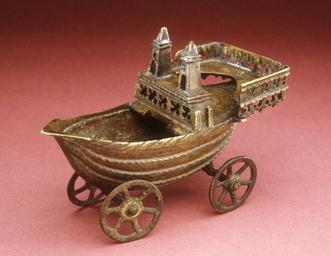 | Keywords: German - Spice Cellar in the Shape of a Ship - Walters 542501.jpg This spice cellar made to hold precious seasonings at the table is of a typical northern European design Major trade commodities in ancient and medieval times salt and other spices were used both to preserve meat and to enhance the flavor of all types of food often not very fresh Some spices came from Asia and were very expensive This whimsical container in the form of a little ship on wheels could be rolled from one guest to another ca 1400 Medieval bronze H 3 3/4 x L 5 9/16 x D 2 11/16 in 9 5 x 14 13 x 6 84 cm accession number 54 2501 26207 Victor Gay Paris Sale Hôtel Drouot Paris March 23 1909 no 258 Leopold Blumka New York date and mode of acquisition unknown Walters Art Museum May 1973 by purchase Museum purchase 1973 Highlights from the Collection The Walters Art Gallery Baltimore 1998-2001 place of origin Netherlands Walters Art Museum license Medieval metalwork in the Walters Art Museum German art in the Walters Art Museum Late medieval way of life preserved and reconstructed artefacts Media contributed by the Walters Art Museum needs category review Media contributed by the Walters Art Museum needs artist review |