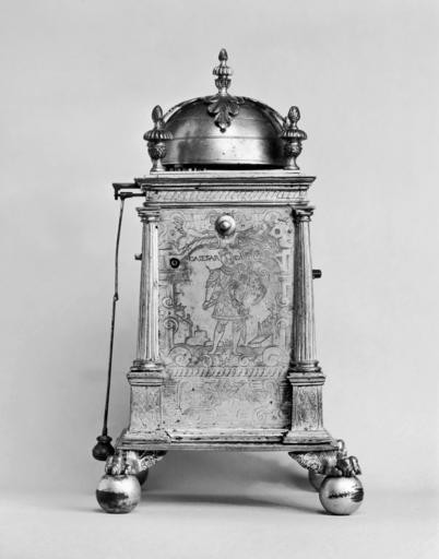 Keywords: German - Table Clock - Walters 58245.jpg This clock indicates the hours 1-24 on the main dial and the quarter hours on the lower dial When the clock was made in 1573 minutes were not in common use as they were hard to measure ; time was usually divided into hours and quarter hours The sides of the case were intended to be removed On the exterior of the left panel is engraved the image of the Habsburg emperor Charles V Caesar Carolus ; the panel on the right has on the inside a sundial for setting the clock and a compass north had to be established to read the sundial On the exterior is engraved the figure of the Old Testament king David The original spring mechanism of the clock was replaced by a pendulum in the late 1600s to improve its accuracy and at that point balls were added to the feet to increase the height 1573 Renaissance gilt on brass and bell metal case gilt on brass dial sttel silver and glass compass iron and brass movement cm 23 5 accession number 58 245 8435 Henry Walters Baltimore date and mode of acquisition unknown Walters Art Museum Henry Walters Acquired by Henry Walters place of origin Schemnitz Slovakia Walters Art Museum license Renaissance turret clocks Renaissance applied arts in the Walters Art Museum German art in the Walters Art Museum Media contributed by the Walters Art Museum needs artist review 1573 in art Bell metal