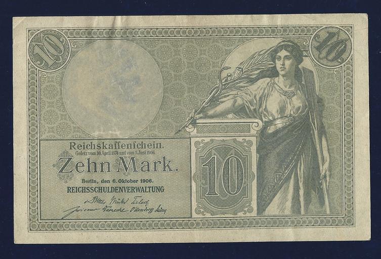 | Keywords: Germany 10 Mark 1906 Art Nouveau Banknote. Obverse.jpg en German 10 Mark 1906 Reichskassenschein Reichsschuldenverwaltung Berlin 6 October 1906 7 digit serial number Pick 9b Design Alexander Zick 1845 Koblenz “ 1907 Berlin Condition High grade Almost EXTREMELY FINE No hidden faults 1906-10-06 own Berlin-George other versions cc-by-sa-4 0 PD-old-100 This photo PD-1923 Banknotes with a face value of 10 Banknotes of Germany Art Nouveau in Germany | ||||