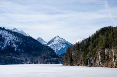 Keywords: germany bavaria schwangau idyllic winter allgäu ostallgäu sky lake mountains panorama landscape nature alpsee forest trees