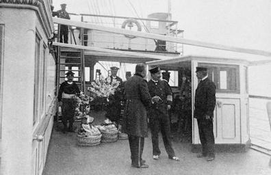 | Keywords: Germany Before the First World War 1890 - 1914 HU68400.jpg en Germany Before the First World War 1890 - 1914<br/> The visit of Kaiser Wilhelm II and Kaiserin Auguste to Palestine in 1898 Snapshot taken by the Kaiserin showing the Kaiser with the German Consul from the Greek island of Mytilene on the deck of the Royal Yacht HOHENZOLLERN 23 October The Consul had brought despatches on board Photograph from a personal collection compiled by the Kaiserin and presented by her to Hugh 5th Earl of Lonsdale Auguste Viktoria Kaiserin of Germany 1898 HU 68400 205018346 http //media iwm org uk/iwm/mediaLib//7/media-7569/large jpg PD-old-70 Germany URAA date Author died in 1921 Associated people and organisations SMS HOHENZOLLERN Wilhelm II Kaiser of Germany Associated events Visit of Kaiser Wilhelm II and Kaiserin Auguste Viktoria to Palestine October 1898 Associated themes Germany pre-1914 Palestine pre-1914 Associated keywords Communications Royalty Lonsdale Hugh 5th Earl Of photographs Wilhelm II of Germany in 1898 Hohenzollern ship 1892 1898 Photographs by Augusta Viktoria of Schleswig-Holstein Imperial War Museum Pre-1914 collection Images uploaded by Fæ |