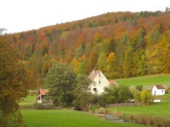 Keywords: germany landscape mountains scenic valley forest trees woods foliage colorful house home buildings farm fields rural rustic country countryside nature outside fall autumn