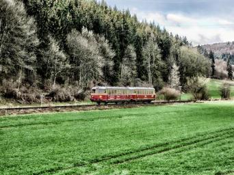Keywords: germany landscape scenic train tram railroad transportation forest trees woods sky clouds nature outside country countryside rural hdr