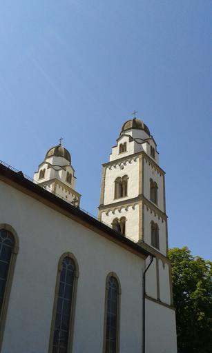 Keywords: germany rheinhessen guntersblum evangelical church sarazenentuerme summer sky blue