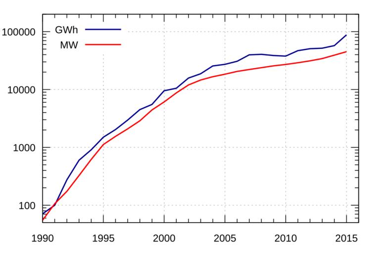 | Keywords: GermanyWind.svg en Wind energy in Germany since 1990; blue production in GWh per year red installed capacity in MW de Entwicklung der Windenergie in Deutschland seit 1990; blau Jahresproduktion in GWh rot installierte Leistung in MW 2016-04-18 own ; fork of Gorgo's File Windenergygermany svg; data from http //www erneuerbare-energien de/EE/Navigation/DE/Service/Erneuerbare_Energien_in_Zahlen/Zeitreihen/zeitreihen html Bundesministerium für Wirtschaft und Energie Log-plot by Limulus with further modifications by Delphi234 Windenergygermany svg Gnuplot script to generate this plot Please note this generates the 18 April 2016 version gnuplot <source lang gnuplot > set timefmt Y set datafile separator ; set term svg size 600 400 font Arial 16 set output 'GermanyWind svg' set key left set style data lines set grid set xdata time set xrange '1990' '2016' set xtics 157788000 set format x ' Y' set logscale y set yrange 50 200000 set mytics 10 plot '-' using 1 2 title ' GWh' axes x1y1 lt rgb 'dark-blue' lw 2 \ '-' using 1 2 title 'MW' axes x1y1 lt rgb 'red' lw 2 1990;71 1991;100 1992;275 1993;600 1994;909 1995;1500 1996;2032 1997;2966 1998;4489 1999;5528 2000;9513 2001;10508 2002;15786 2003;18713 2004;25509 2005;27229 2006;30710 2007;39713 2008;40574 2009;38648 2010;37793 2011;46883 2012;50670 2013;51708 2014;57357 2015;87975 e 1990;55 1991;106 1992;174 1993;326 1994;618 1995;1121 1996;1549 1997;2089 1998;2877 1999;4435 2000;6097 2001;8738 2002;11976 2003;14593 2004;16612 2005;18375 2006;20568 2007;22183 2008;23815 2009;25662 2010;27092 2011;29045 2012;31264 2013;34271 2014;39193 2015;45018 e </source> cc-zero Wind energy statistics of Germany SVG charts in German Images with Gnuplot source code |