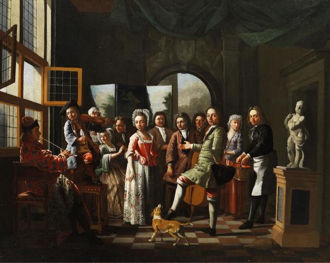 | Keywords: Gesellschaft mit jungem Paar.jpg Gesellschaft mit jungem Paar u a mit einem Geigenspieler einem Gambenspieler einem Bedienten oder Wirt und einem Pfeifenraucher oil on canvas 65 x 82 cm http //www hampel-auctions com/ century 18 anonymous painter old paper label on the back with illegible name and dates ž1709 “1757 Antwerpen PD-old-100 18th-century fashion paintings of couples Marriage in art People with dogs in art Paintings of sculptures Servants in art Smoking men in art Violinists in art Viols in art Baroque paintings of musicians Pets in art Images from Hampel Auctions 18th-century paintings of musicians |