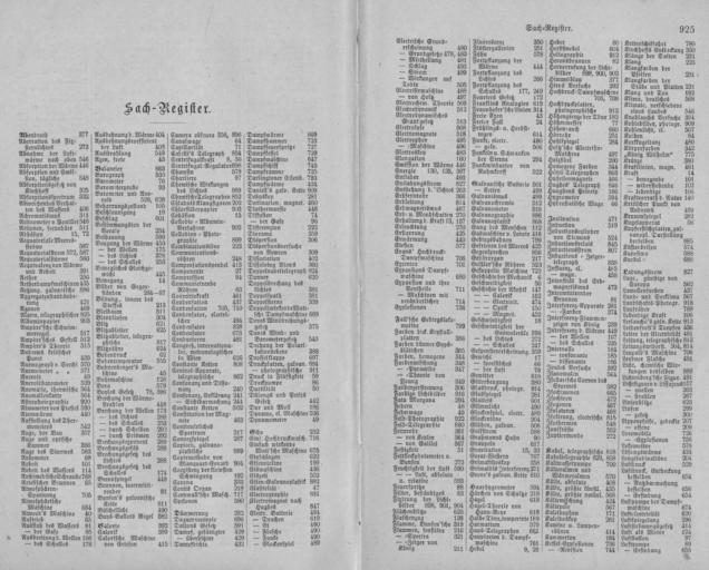 | Keywords: GesNat924.jpg Seiten 924 und 925 des 1873 erschienen Buches žDie gesammten Naturwissenschaften žDie gesammten Naturwissenschaften 2009-12-18 siehe Abbildung des Titelblatts gescannt von Benutzer Wefo Inhalt<ref>vorhergehende Seiten Abbildung File blau jpg File GesNat924 jpg dieser Seiten nachfolgende Seiten Inhaltsverzeichnis <br />Sach-Register <br />Abendroth 377 <br />Aberation des Fixsternlichts 273 <br />Abnahme der Luftwärme nach oben 546 <br />Absorption der Wärme 446 <br />Absorption und Emission tägliche 548 <br />Absorptionsgesetz von Kirchhoff 325 <br />Absorptionsspektrum 332 <br />Abweichendes Verhalten des Wassers 406 <br />Achromatismus 311 <br />Actinometer v Ponillet 548 <br />Actionen sekundäre 511 <br />Adhäsion 15 72 <br />Aequatoriale Meeresströme 587 <br />Aequatorialstrom 572 587 <br />Aequatorialstürme 580 <br />Aequivalenz von Wärme und Arbeit 391 <br />Aether 256 <br />Aetherdampfmaschinen 435 <br />Aetzung galvanische 886 <br />Aggregatzustandsänderung 421 <br />Agonen 469 <br />Alarm telegraphischer 825 <br />Albuminpapier 903 <br />Ampère'sche Schwimmerregel 517 <br />Ampère'sches Gestell 512 <br />Ampère's Theorie 515 <br />Andrews kritischer Punkt 439 <br />Anemograph v Secchi 570 <br />Anemometer v Secchi 571 <br />Aneroid 49 <br />Aneroidbarometer 529 <br />Anomalie thermische 564 <br />Anomalienkarte 564 <br />Astrophotographie 920 <br />Atmometer von Prestel 590 <br />Atomwärme 440 <br />Aufstellung des Thermometers 542 <br />Auge der Bau 357 <br />Auge und optische Kammer 356 <br />Auge des Sturmes 583 <br />Aräometer 68 <br />Arbeit 101 <br />Arbeit des Wassers 114 <br />Archimedische Schraube 768 <br />Artesischer Brunnen 65 <br />Atmosphären-Spannung 705 <br />Atmosphärische Maschine 664 <br />Atwood's Maschine 40 <br />Auftrieb 65 <br />Ausfluß des Wassers 81 <br />Ausfluß der Gase 95 <br />Ausbreitung d Wellen 166 <br />Ausbreitung des Schalles 176 <br />Ausdehnung d r Wärme 404 <br />Ausdehnungscoefficient der Luft 408 <br />Ausstrahlung 549 <br />Axen freie 43 <br />Balancier 663 <br />Barograph 530 <br />Barometer 76 <br />Barometerprobe 93 <br />Barometer und Aneroid 529 628 <br />Beharrungszustand 105 <br />Beschleunigung 19 <br />Beschlag 601 <br />Bestimmungston der Vocale 234 <br />Bethauung 599 <br />Beugung der Wärme 450 <br />Beugung der Wellen 175 <br />Beugung des Lichtes 378 <br />Beugung des Schalles 253 <br />Bewegliches Gleichgewicht 445 <br />Bewegung 14 <br />Bilder von Gegenständen 284 - 287 <br />Bildung innere des Stoffes 213 <br />Bleibaum 511 <br />Blendlinsen 304 <br />Blitz 621 <br />Blitzableiter 625 <br />Blitzableiter telegraphische 817 <br />Blitzröhre 624 <br />Bodendruck 62 <br />Bodentemperatur 555 <br />Bohnenberger's Maschine 45 <br />Bohrmaschine 128 <br />Bora 579 <br />Boyles Gesetz 78 396 <br />Brechung der Wärmestrahlen 448 <br />Brechung der Wellen 173 <br />Brechung des Lichtes 288 <br />Brechung des Schalles 253 <br />Brechung durch Scheiben 292 <br />Brechung durch Prismen 292 <br />Brechungsexponent 289 <br />Brechungsgefäß 289 <br />Brechungsgesetz des Lichtes 288 <br />Brechungsgesetz des Schalles 174 <br />Brennspiegel 449 <br />Brunnen intermittierender 81 <br />Bunsen's galvanische Kette 811 <br />Büschellicht 490 <br />Buys-Ballots Regel 582 <br />Calorie 392 <br />Calorik 389 <br />Calorische Maschine von Ericson 415 <br />Camera obscura 358 896 <br />Canalwage 64 <br />Capillarität 71 <br />Caselli's Telegraph <br />Centrifugalkraft 8 36 <br />Centrifugal-Regulator 698 <br />Chamsin 579 <br />Charliere 97 <br />Chemische Wirkungen des Lichts 889 <br />Chemische Telegraphen 852 <br />Chladnis Klangfiguren 202 <br />Chlorsilberpapier 903 <br />Cohäsion 15 <br />Collodio-Albumin-Verfahren 902 <br />Collodion-Photographie 899 <br />Combinationstöne 223 <br />Communicationsröhren 248 <br />Compensationspendel 413 <br />Componente 27 <br />Compression 94 <br />Communicirende Röhren 63 <br />Coërcitivkraft 461 <br />Condensatiom 705 710 <br />Condensator 673 <br />Conductoren 481 <br />Congreß internationaler meteorologischer in Wien 626 <br />Control-Apparate relegraphische 862 <br />Consonanz und Dissonanz 240 <br />Consonanz Erklärung 241 <br />Constante Ketten 808 502 <br />Constitution der Magnete 463 <br />Continuirliches Spectrum 317 <br />Convexspiegel 287 <br />Copieen galvanoplastische 869 <br />Copirmethode von Blanquart-Evrard 904 <br />Coexistenz der kleinsten Schwingung 192 <br />Corona 333 <br />Cortis Organ 218 <br />Cornwall'sche Maschine 717 <br />Cyclonen 580 <br />Dämmerung 282 <br />Daguerreotypie 896 <br />Daltons Gesetz 591 <br />Dampf gesättigter 429 <br />Dampf überhitzter 429 <br />Dampfdichte 432 <br />Dampfwärme 434 669 <br />Dampfhammer 723 <br />Dampffeuerspritze 727 <br />Dampfkessel 729 <br />Dampfmaschine 647 <br />Dampframme 725 <br />Dampfschiff 745 <br />Darlingtoner Eisenbahn 793 <br />Daniell's galvanische Kette 809 <br />Debuskop 281 <br />Declination magnetische 460 <br />Diathermansie 448 <br />Diffusion 74 <br />Diffusion der Gase 096 <br />Differenzton 222 <br />Diorama 359 <br />Dispersion 306 <br />Dispersionsversuche von Newton 309 <br />Dissociation 402 <br />Dissolving Views 360 <br />Doppelnadeltelegraph 824 <br />Donner 620 <br />Doppelbrechung des Lichtes 381 <br />Doppelspath 381 <br />Doppelsterne 339 <br />Doppeltwirkende Wattsche Dampfmaschine 689 <br />Doves Winddrehungsgesetz 575 <br />Doves Wind- und Barometergesetz 540 <br />Drehung der Polarisationsebene 388 <br />Drosselklappe 697 <br />Druckplatten galvanische 884 <br />Druckplatten photographische 911 <br />Druck in Flüssigkeit 59 <br />Druckpumpe 86 <br />Ductilität 50 <br />Dülongs und Petits Gesetz 442 <br />Dur und Moll 186 <br />Dynamo electrische Maschine 526 <br />Dynamometer 49 <br />Echo 252 <br />Einfache Hochdruckmaschine 716 <br />Einfach wirkende Watt'sche Maschine 675 <br />Einschlagen 622 <br />Eisenvioline 199 <br />Eism
