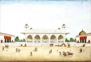 | Keywords: Ghulam Ali Khan 013b.jpg The Reception Room in the Dewan Khas in the Red Fort A series of 31 paintings by Ghulam Ali Khan fl 1817-55 consisting of views of monuments in and around Delhi and including four portraits of the last Mughal Emperor Bahadur Shah II reg 1837-58 and his sons Watercolour and gold on paper black margin rules three title pages three sheets of portraits all with identifying inscriptions in English and in Persian in nasta'liq script in black ink the portraits with further inscriptions in nasta'liq script with the date November 1852 Christian date written in Arabic in later mounts loose in contemporary green leather-covered despatch box the lid embossed in gold DELHEE 1854 Size paintings 290 x 215 mm and slightly smaller; mounts 318 x 394 mm ; box 435 x 365 x 110 mm File Ghulam Ali Khan 013 jpg circa 1852 1854 Ghulam Ali Khan PD-Art-100 Diwan-i-Khas Red Fort Red Fort in art |