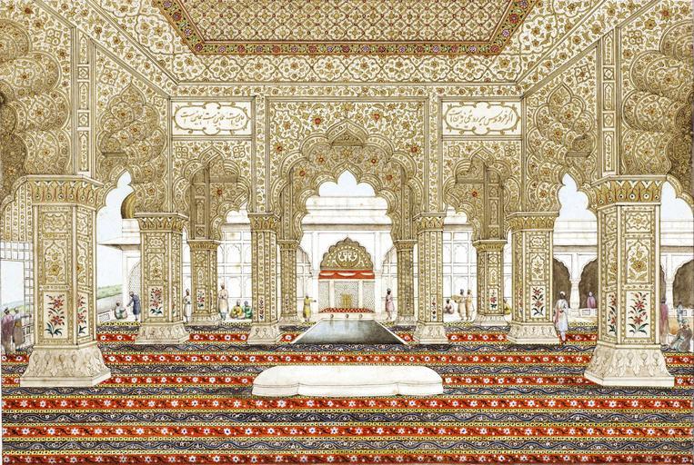 | Keywords: Ghulam Ali Khan 014b.jpg The interior of the Dewan Khas - and the Tusbee Khana in the Red Fort A series of 31 paintings by Ghulam Ali Khan fl 1817-55 consisting of views of monuments in and around Delhi and including four portraits of the last Mughal Emperor Bahadur Shah II reg 1837-58 and his sons Watercolour and gold on paper black margin rules three title pages three sheets of portraits all with identifying inscriptions in English and in Persian in nasta'liq script in black ink the portraits with further inscriptions in nasta'liq script with the date November 1852 Christian date written in Arabic in later mounts loose in contemporary green leather-covered despatch box the lid embossed in gold DELHEE 1854 Size paintings 290 x 215 mm and slightly smaller; mounts 318 x 394 mm ; box 435 x 365 x 110 mm File Ghulam Ali Khan 014 jpg circa 1852 1854 Ghulam Ali Khan PD-Art-100 Diwan-i-Khas Red Fort Red Fort in art |