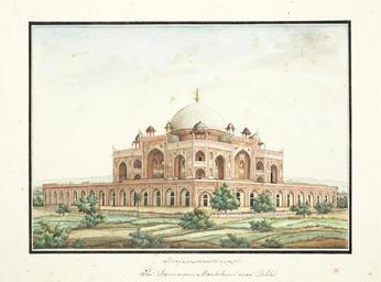 | Keywords: Ghulam Ali Khan 028.jpg The Hoomayoon Mausoleum near Delhee Humayun's tomb from Arab Sarai side A series of 31 paintings by Ghulam Ali Khan fl 1817-55 consisting of views of monuments in and around Delhi and including four portraits of the last Mughal Emperor Bahadur Shah II reg 1837-58 and his sons Watercolour and gold on paper black margin rules three title pages three sheets of portraits all with identifying inscriptions in English and in Persian in nasta'liq script in black ink the portraits with further inscriptions in nasta'liq script with the date November 1852 Christian date written in Arabic in later mounts loose in contemporary green leather-covered despatch box the lid embossed in gold DELHEE 1854 Size paintings 290 x 215 mm and slightly smaller; mounts 318 x 394 mm ; box 435 x 365 x 110 mm http //www bonhams com/auctions/20833/lot/352/ circa 1852 1854 Ghulam Ali Khan PD-Art-100 Sketches of The Delhee Palace Delhee 1854 Main monument Humayun's Tomb |