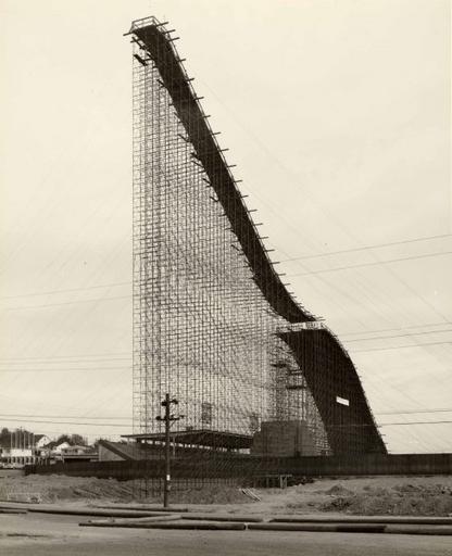 Keywords: outdoor monochrome Temporary giant ski-jump structure erected at Empire Stadium in Vancouver, BC. April 30, 1958 photograph while under construction. In conjunction with the 1958 B.C. Centennial, the PNE staged a variety of special features at the fair. The most notable was the ski-jumping competition held in Empire Stadium. Thousands watched the event, though most chose to view the show from outside the stadium rather than pay for a seat inside, which meant that financially the event was something of a disaster. [Photographer unknown (Otto F. Landauer?)] Photo source: www.google.ca/imgres?imgurl=http://img.wendmag.com/upload... Temporary giant ski-jump structure erected at Empire Stadium in Vancouver, BC. April 30, 1958 photograph while under construction. In conjunction with the 1958 B.C. Centennial, the PNE staged a variety of special features at the fair. The most notable was the ski-jumping competition held in Empire Stadium. Thousands watched the event, though most chose to view the show from outside the stadium rather than pay for a seat inside, which meant that financially the event was something of a disaster. [Photographer unknown (Otto F. Landauer?)] Photo source: www.google.ca/imgres?imgurl=http://img.wendmag.com/upload...