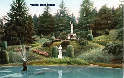 Keywords: Versione colorata. Vista sulla fontana centrale e sul busto di Umberto I. Sopra la fontana a grottesco (1767-69) si innalza su un alto piedistallo la statua dell'Italia liberata. varese giardinipubblici