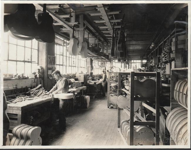 Keywords: kalamazoo public library michigan history photography gibson factory manufacturing musical instruments guitar worker Interior of Gibson, Inc., the general assembly room. Several unidentified men at work benches. Many guitar bodies on wheeled racks or hanging from the ceiling. For more information on Gibson Inc. read: www.kpl.gov/local-history/business/gibson.aspx KPL catalogue number P-78. Interior of Gibson, Inc., the general assembly room. Several unidentified men at work benches. Many guitar bodies on wheeled racks or hanging from the ceiling. For more information on Gibson Inc. read: www.kpl.gov/local-history/business/gibson.aspx KPL catalogue number P-78. |