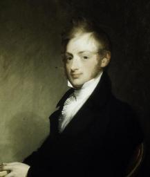 | Keywords: Gilbert Stuart - Portrait of Alexander Townsend (1784-1835) - 51.34 - Minneapolis Institute of Arts.jpg portrait; seated three-quarters to the left eyes dark blue hair and side-whiskers light sandy color; left hand resting on table holds a book into which his index finger is thrust; black coat buttoned white collar neckcloth and a starched ruffed shirt 33 1/4 x 26 1/2 in 84 46 x 67 31 cm canvas 51 34 https //api artsmia org/images/1183/3796/large jpg Q1700481 Oil on panel Portrait of Alexander Townsend 1784-1835 https //collections artsmia org/index php page detail id 1183 Q20890799 |