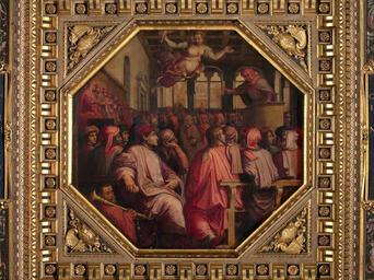 | Keywords: Giorgio Vasari - Speech by Antonio Giacomini for the war against Pisa in the Sala dei Duecento - Google Art Project.jpg special url_id AgGGjphnYeZ6cQ PD-old-100-1923 1574 Paintings by Giorgio Vasari Google Art Project works by Giorgio Vasari Salone dei Cinquecento - Ceiling History of Florence History of Pisa | ||||