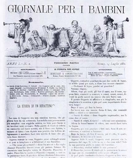 | Keywords: Giornaleperibambini.jpg it Prima pagina del Giornale per i bambini del 14 luglio 1881 secondo numero del primo anno con il terzo capitolo di La storia di un burattino di Collodi poi diventato Le avventure di Pinocchio Storia di un burattino In questo terzo capitolo compare per la prima volta il nome del burattino protagonista Pinocchio scan of a book Franco Cambi Collodi De Amicis Rodari tre immagini d'infanzia 1985 pag 41 Creator Collodi 1881-07-14 Pinocchio PD-old | ||||