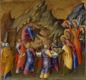 | Keywords: Giovanni di Paolo - The Entombment - Walters 37489D.jpg This is one of four early masterpieces by Giovanni di Paolo in the Walters It was originally part of a predella paintings on the base of an altarpiece in the chapel of the Malavolti family in the church of San Domenico in Siena The main altar panel dated 1426 and depicting the Virgin and Child flanked by saints is in Italy The predella panels show chronologically the Resurrection of Lazarus the Way to Calvary the Descent from the Cross and the Entombment Originally an image of the Crucifixion now in Germany would have been in the center Throughout his career Giovanni di Paolo referred to the pictorial tradition of his native Siena that was rooted in Byzantine art and is characterized by in particular the gold ground and the stylized rock formations Zeri Italian paintings in the Walters Art Gallery 78a-d 116-121 1426 Renaissance tempera and gold leaf on panel Painted surface cm 40 4 43 8 2 7 ; Framed cm 46 8 50 6 5 accession number 37 489D 29964 The Church of San Domenico Siena 1426 Pecci-Paganucci altar until mid 16th century Malavolti altar from the early 17th century Refectory from the early 17th to perhaps the late 18th century Comm Galgano Saracini Siena prior to 1819 mode of acquisition unknown 1819 catalogue no 1257-1260 as Duccio di Segna The Counts Chigi-Saracini Siena date and mode of acquisition unknown Luigi Grassi Florence date and mode of acquisition unknown Henry Walters Baltimore 1911 mode of acquisition unknown Walters Art Museum Henry Walters Acquired by Henry Walters 1911 The Taste of Maryland Art Collecting in Maryland 1800-1934 The Walters Art Gallery Baltimore 1984 Highlights from the Collection The Walters Art Gallery Baltimore 1998-2001 The Early Renaissance in Siena Complesso Museale Santa Maria della Scala Siena 2010 place of origin Siena Italy Walters Art Museum license 2D Italian Renaissance paintings in the Walters Art Museum Passion by Giovanni di Paolo Paintings of Entombment of Christ Paintings in the Walters Art Museum |