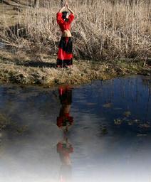 Keywords: gipsy dance lake reflection water red beauty girl motion spinning