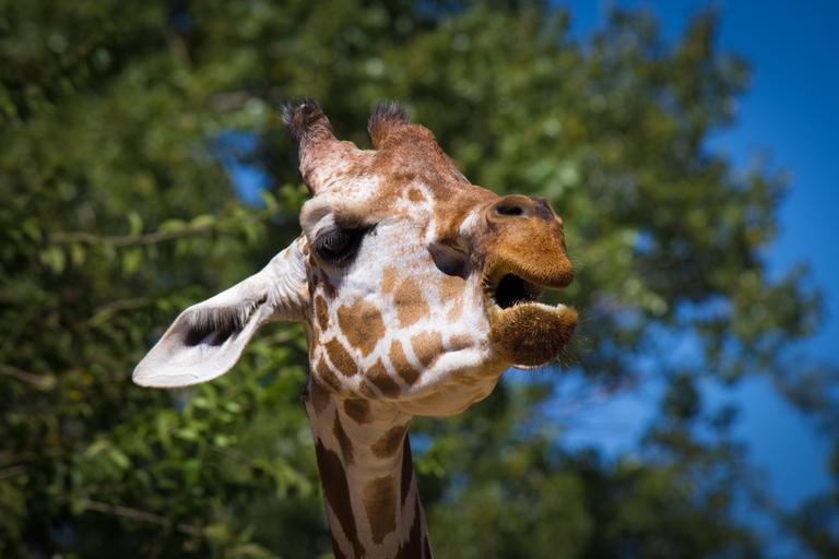Keywords: giraffe animal zoo headphones fauna long neck open mouth yawn