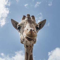 Keywords: giraffe head close zoo wildlife animal mammal horns african portrait brown sky pattern face reticulated ears mouth eyes neck