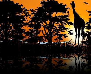 Keywords: giraffe zoological animals savannah west sunset sol trees african against light reflection lake