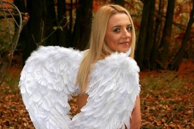 Keywords: girl angel autumn wings leaves red white blonde beauty paradise forest tree