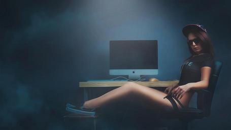 Keywords: girl at computer svèg fashionable girl in the cap in panties sexy gym shoes sneakers shirt in glasses girl computer mack hair art beauty fashion view posture dress hairstyle emotions