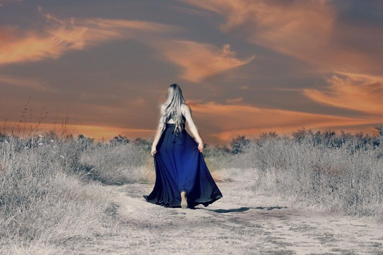 Keywords: girl blonde dress blue road back sunset wind sky cloud