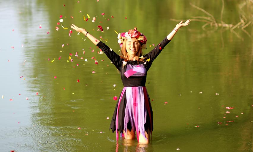 Keywords: girl blonde wreath water petals joy nature