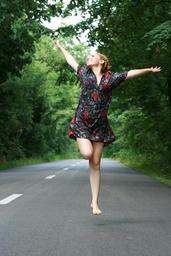 Keywords: girl bounce road forest happiness