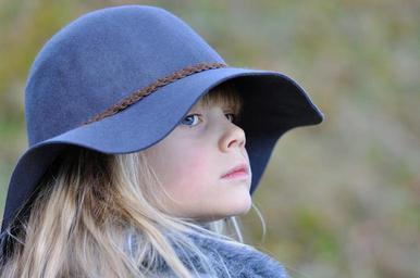 Keywords: girl child blond hat view self-conscious consider knowing pride haughty