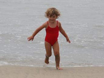 Keywords: girl child happy beach coastal area sea ocean waves water playing childhood smiles smiling laughing cheerful joyful playful running kid young small little wearing red excited excitement fun toddler enjoying