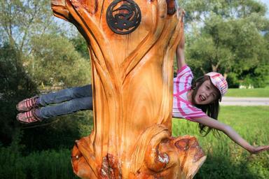 Keywords: girl child play illusion carving wood carving crane bird nature trail marker southern ontario art carved wood sculpture