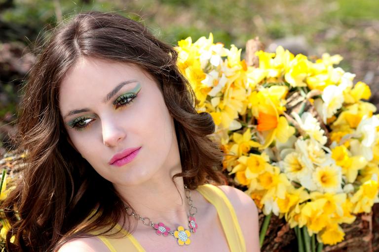 Keywords: girl daffodil yellow flowers spring beauty
