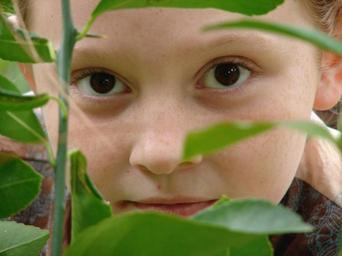 Keywords: girl face sneaky leaf green brown eyes outdoors young curiosity secret peeking explore curious look flora peek nature discovery search childhood watching exploring searching