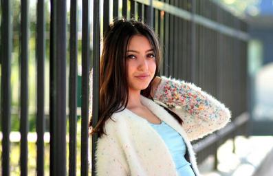 Keywords: girl fence brunette brown eyes fashion